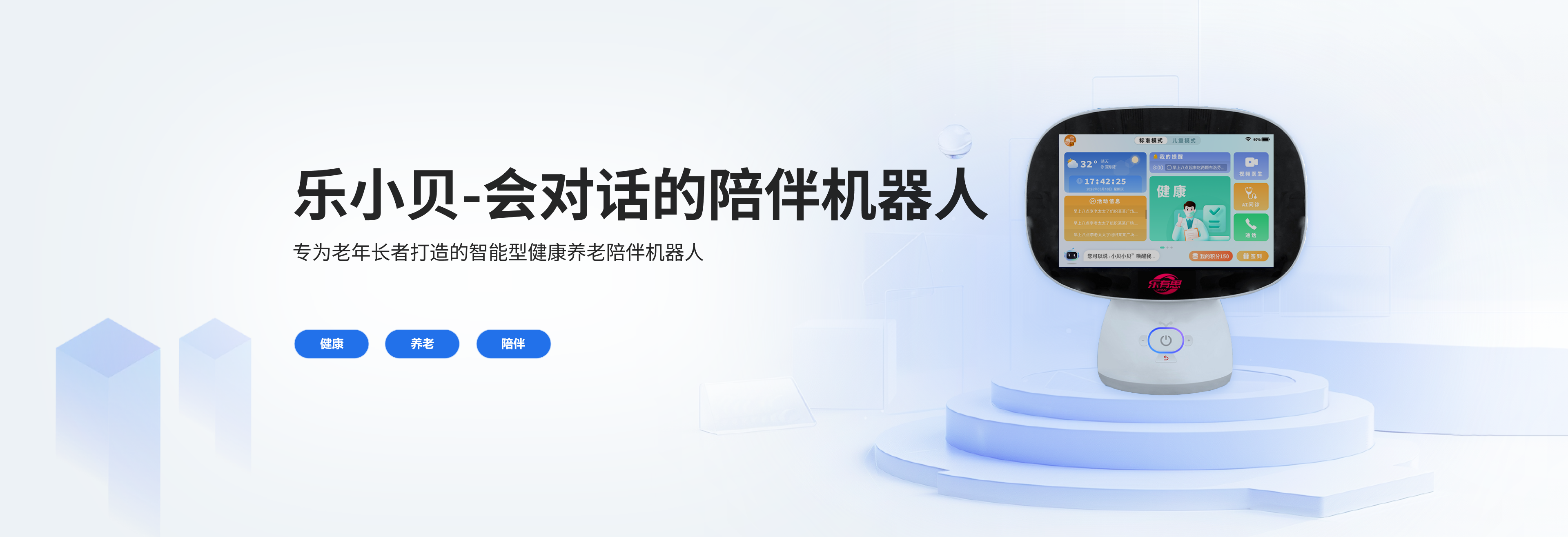 乐小贝是一款专为老年长者打造的智能型健康养老陪伴机器人,可以满足“健康+养老+陪伴”多种老年群体的日常生活刚需。 乐小宝具备丰富的服务能力,包括了健康服务、生活服务、家庭互动、娱乐陪伴等四大服务功能。可为老年人提供精准的健康养老陪伴服务,同时兼顾老人长者和小孩的日常需求。包括视频医生、在线购药、健康检测与分析、音视频通话、流行音乐、生活提醒、在线视频、智能家居、智益游戏等多功能结合。
